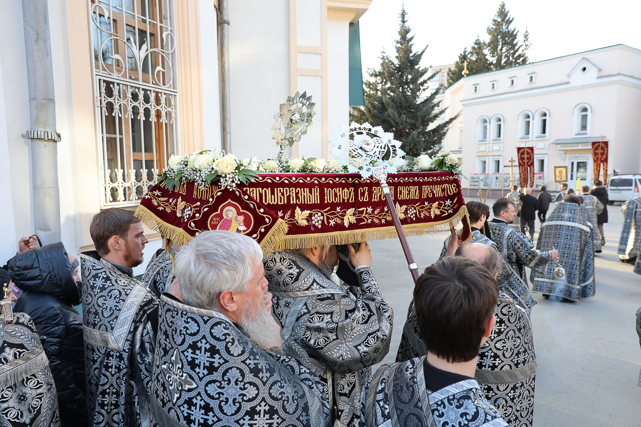 После великого славословия с пением погребального «Святый Боже» был совершен крестный ход с Плащаницей Спасителя вокруг собора.