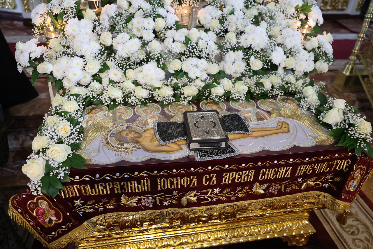 В конце вечерни, при пении тропаря «Благообразный Иосиф, с древа снем Пречистое Тело Твое», из алтаря на середину храма была перенесена Святая Плащаница с изображением погребения Христа.